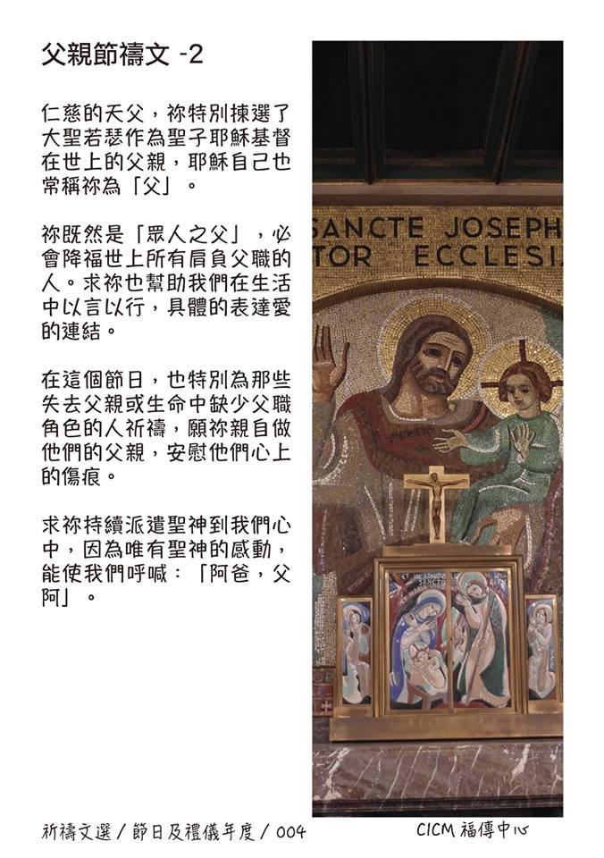 在這個節日,也特別為那些失去父親或生命中缺少父職角色的人祈禱,願祢親自做他們的父親,安慰他們心上的傷痕。