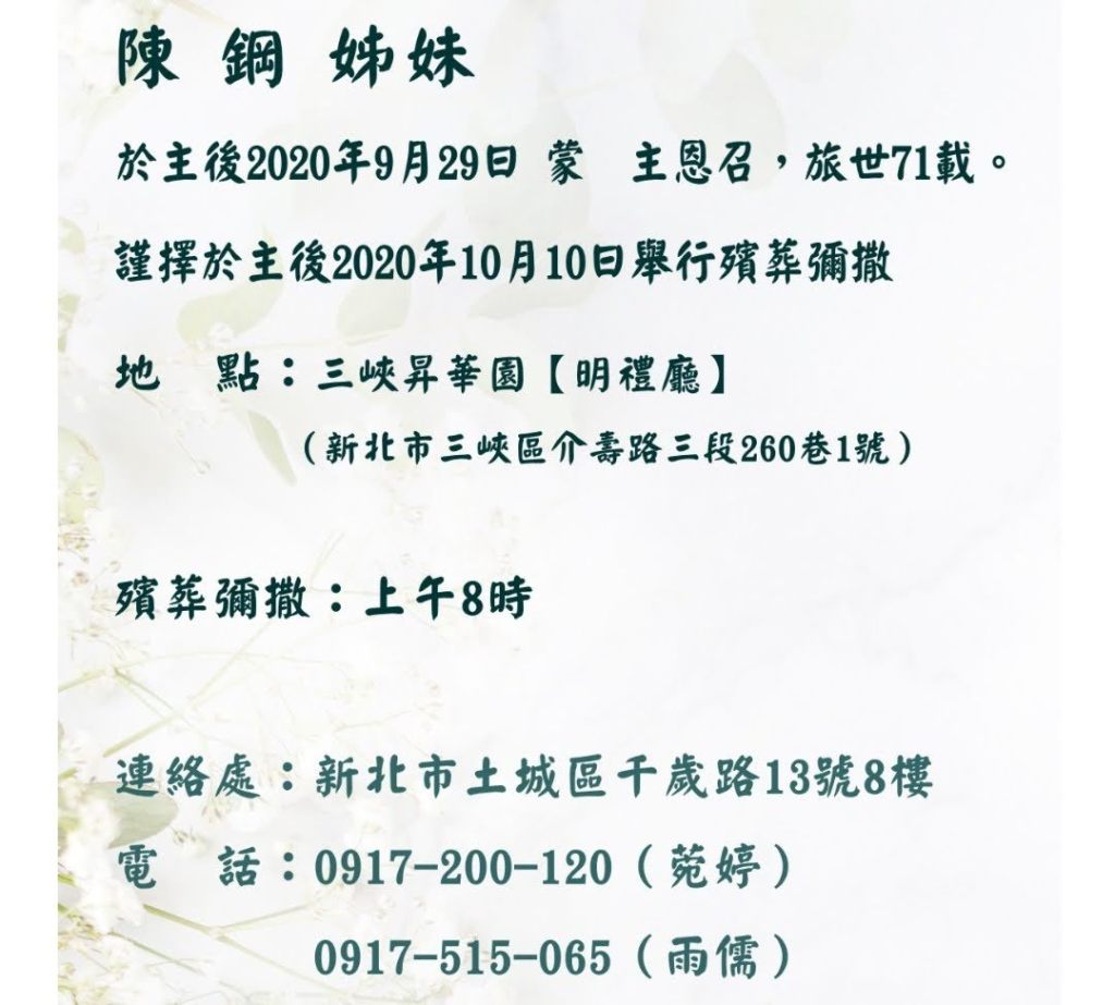 <本會訊>FOC會員陳鋼姊妹於9月29日蒙主恩召,事出突然,甚為震驚與不捨,誠請主內外弟兄姊妹為陳鋼姊妹代禱,願天主引領她並永享天國的福樂。謹擇於2020年10月10日上午8時於三峽昇華園,明禮廳舉行殯葬彌撒,懇請認識陳姊妹的朋友們來送她最後一程。以下是相關的訃聞,敬請參閱 :